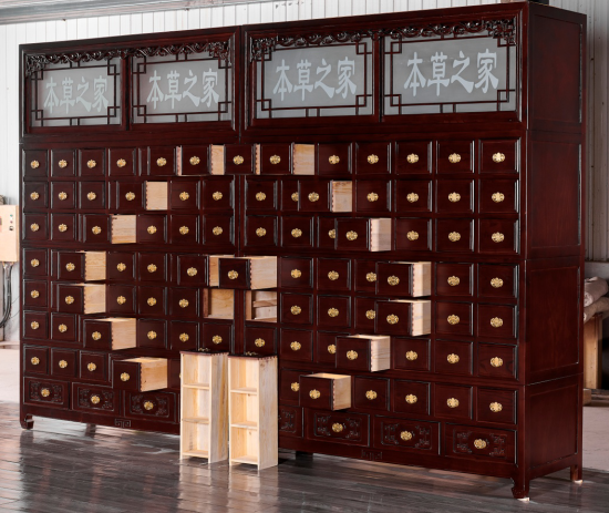 結(jié)構(gòu):四分體 橫七豎八 上面七層抽屜每個(gè)分三格,最底層四個(gè)大抽屜每個(gè)分兩格,共盛放155味藥。